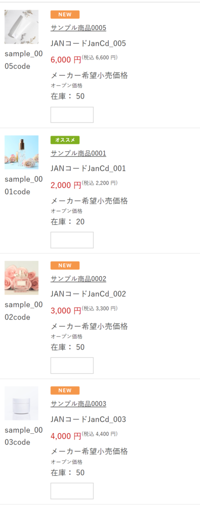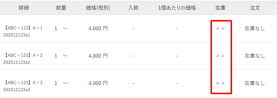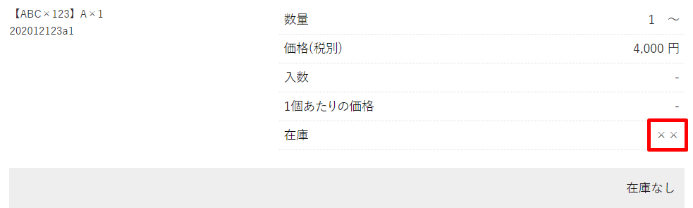 規格商品で在庫数が0のとき、 ※初期設定は「×」です。 |