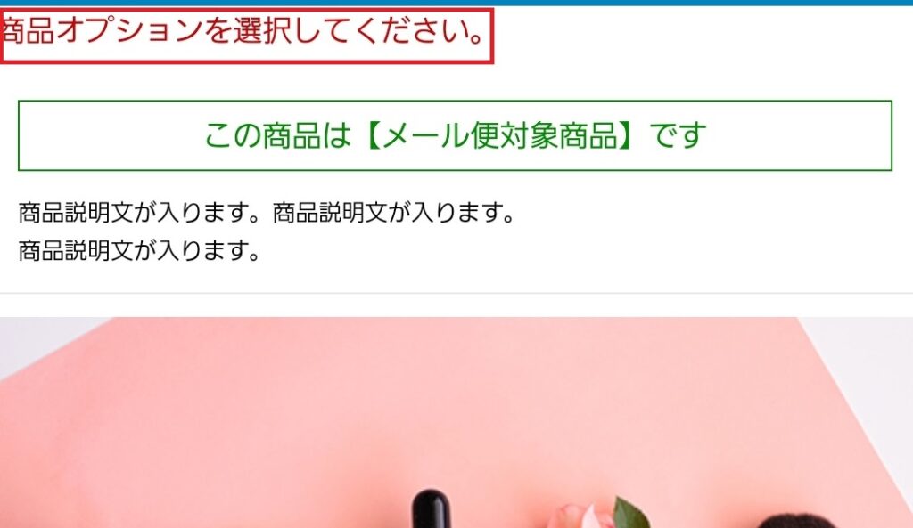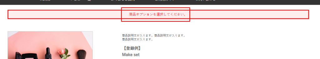 ※選択肢「選択してください」を選択してカート画面に進もうとした場合のエラー表記