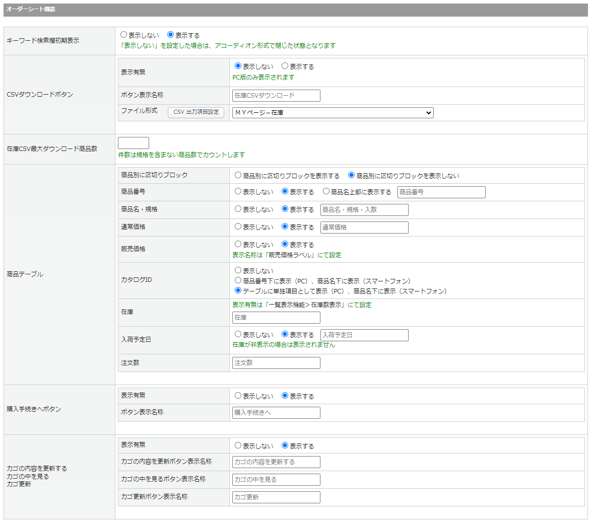 | 表示 | 注文確認画面で設定した内容を表示するかしないかを設定します。 |