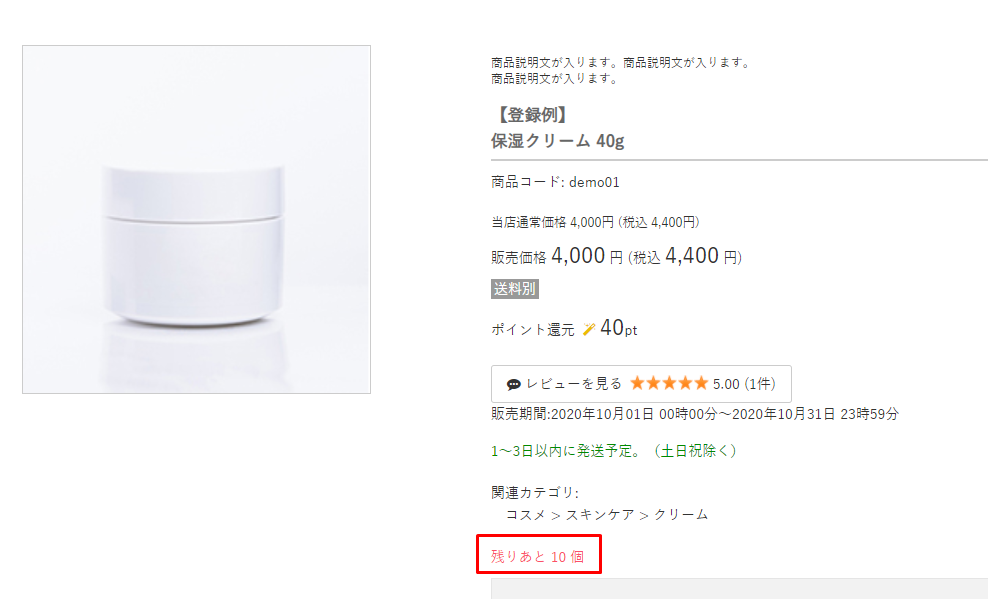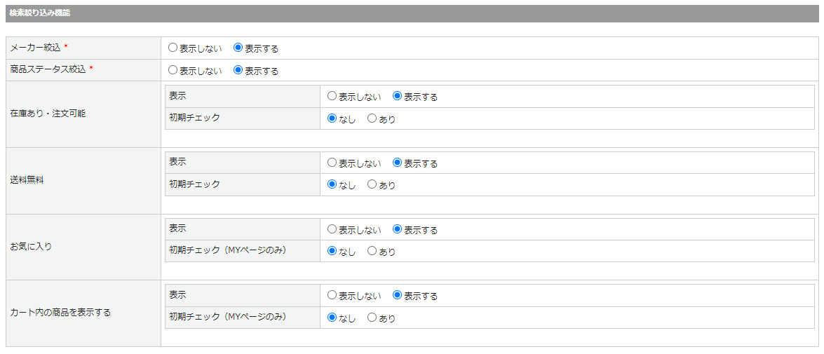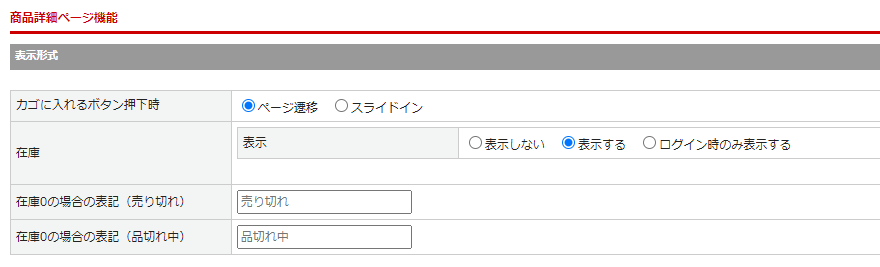 | 在庫数表示 | 商品詳細ページの在庫数表示の表示に関する設定が可能です。 |