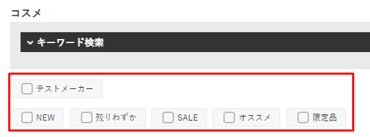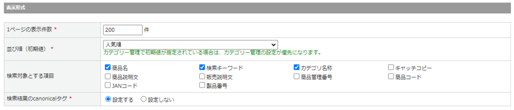 | 検索対象とする項目 | 検索キーワードで検索対象とする項目を設定できます。 ※検索対象とする項目を変更後、各出品商品を再保存することで各出品商品の検索対象項目が再設定されます。 |