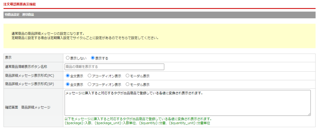 | 商品詳細メッセージ表示形式(SP) | SPの商品詳細メッセージを表示するときの表示方法を選択します。 |