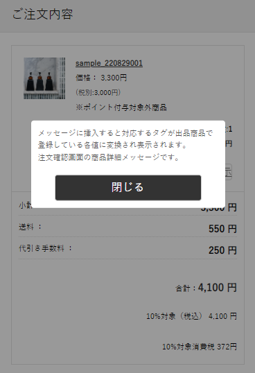 商品詳細メッセージ表示形式(SP):モーダル表示 の表示例