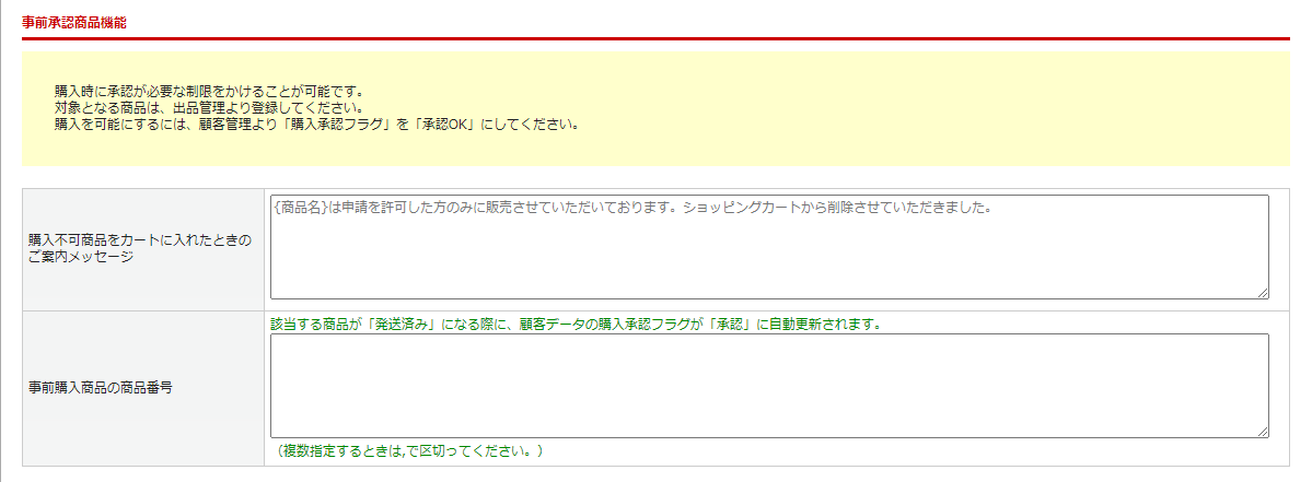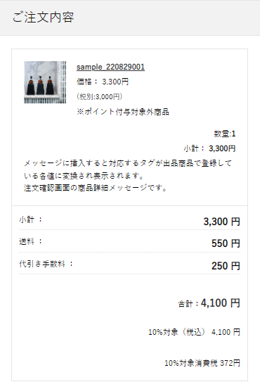 | 確認画面 商品詳細メッセージ | 商品詳細メッセージの内容を設定します。 ※出品商品登録の「画面表示用メッセージ」を設定した場合、出品商品登録で設定した内容が表示されます。 |