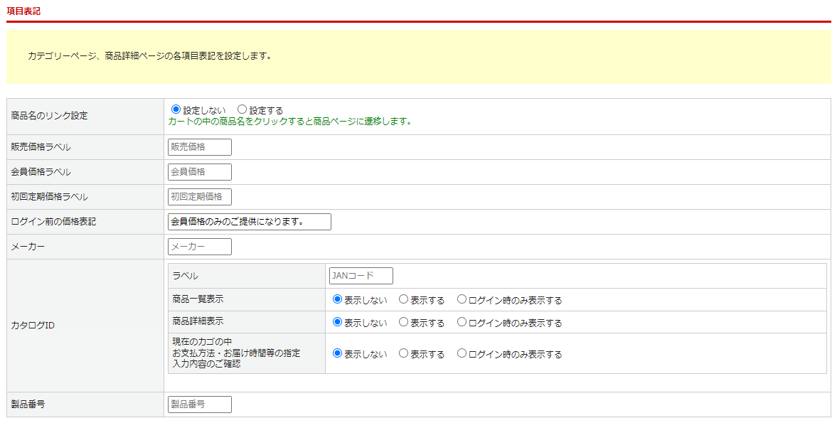 カテゴリーページ、商品詳細ページの各項目表記の設定です。