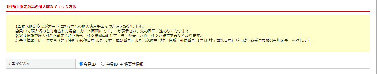 1回購入限定商品がカートにある場合の購入済みチェック方法の設定です。