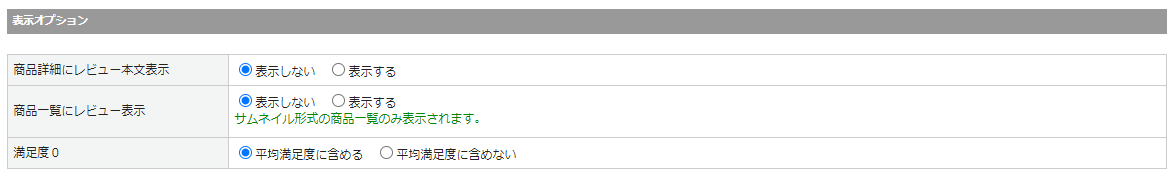 | 商品一覧にレビュー表示 | 商品一覧ページのレビュー表示有無を設定してください。 ※サムネイル形式の商品一覧のみ表示されます。 ※旧レイアウトのカテゴリーページをご利用の場合にのみ表示されます。 |