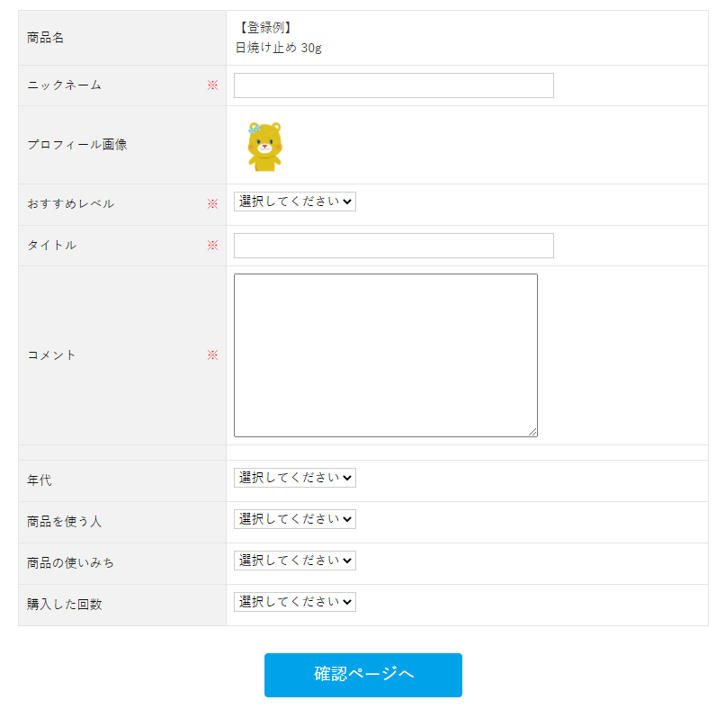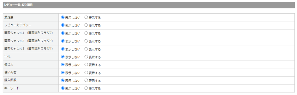 レビュー投稿時の各項目の表示有無を設定してください。 下記の項目の選択肢の内奥は、システム設定>マスターデータ管理から変更可能です。 ・年代…レビュー管理:年代 ・商品を使う人…レビュー管理:利用する人 ・商品の使いみち…レビュー管理:使い道 ・購入した回数…レビュー管理:購入回数 |