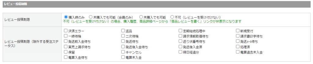 | レビュー投稿制限(除外する受注ステータス) | 受注とレビューが紐づいている場合に、レビュー投稿から除外する受注ステータスを指定してください。 |