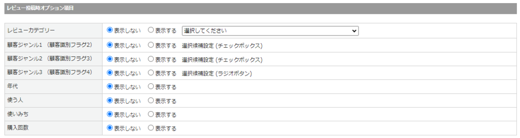 レビュー投稿時の各項目について、表示/非表示を設定します。