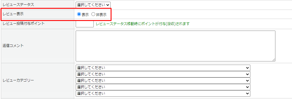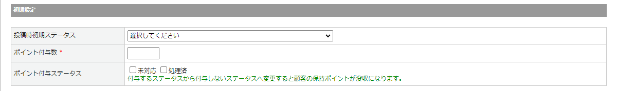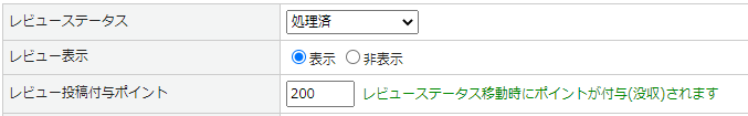 | ポイント付与ステータス | ポイント付与対象のレビュー投稿のステータスを選択してください。 ※投稿時初期ステータスを選択した場合、投稿時にポイントが自動付与されます。 ※「レビュー表示」が非表示の場合もポイント付与されます。 |