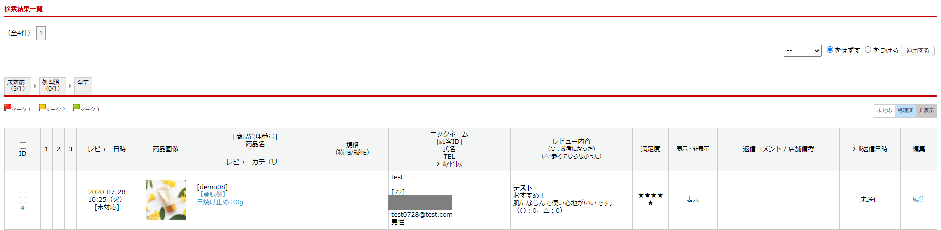 出品管理>レビュー管理にて投稿されたレビューの確認が可能です。
