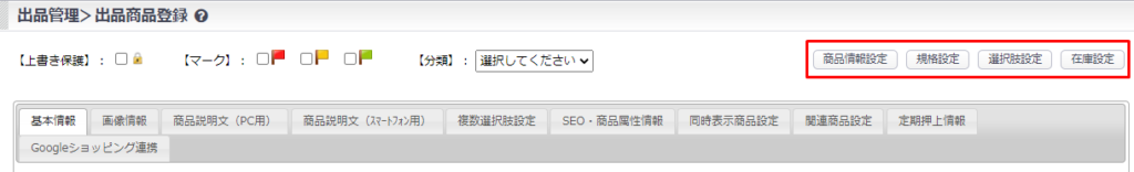 1基本情報管理項目、基本情報、在庫情報、商品登録設定、
