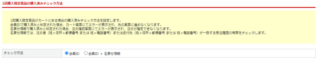 出品商品登録時に「1回限定販売設定」が[設定する(規格別)]もしくは[設定する(商品別)]に設定されているとき、一度購入したことがある顧客が再度購入しようとすると該当のエラーが表示されます。