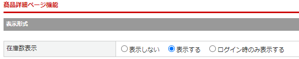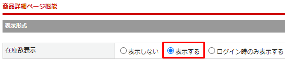 「在庫数表示」の設定で「表示する」、または「ログイン時のみ表示する」を設定します。