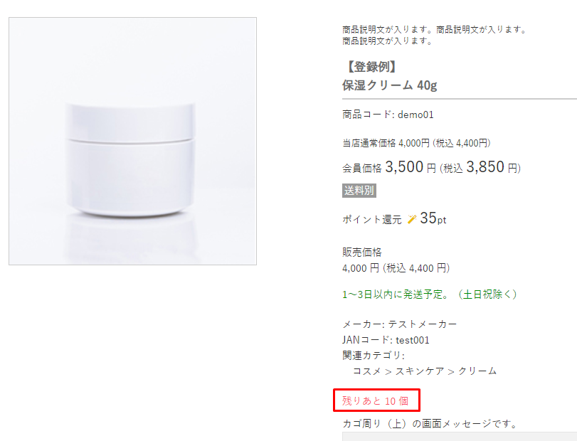 下記の項目を設定することで、商品在庫数を商品詳細ページに表示することができます。