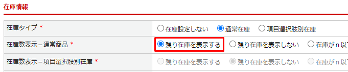 「在庫数表示-通常商品/項目別選択肢別在庫」の「残り在庫を表示する」、または「在庫がn以下になったら「残りあとわずか」を表示する」を設定します。
