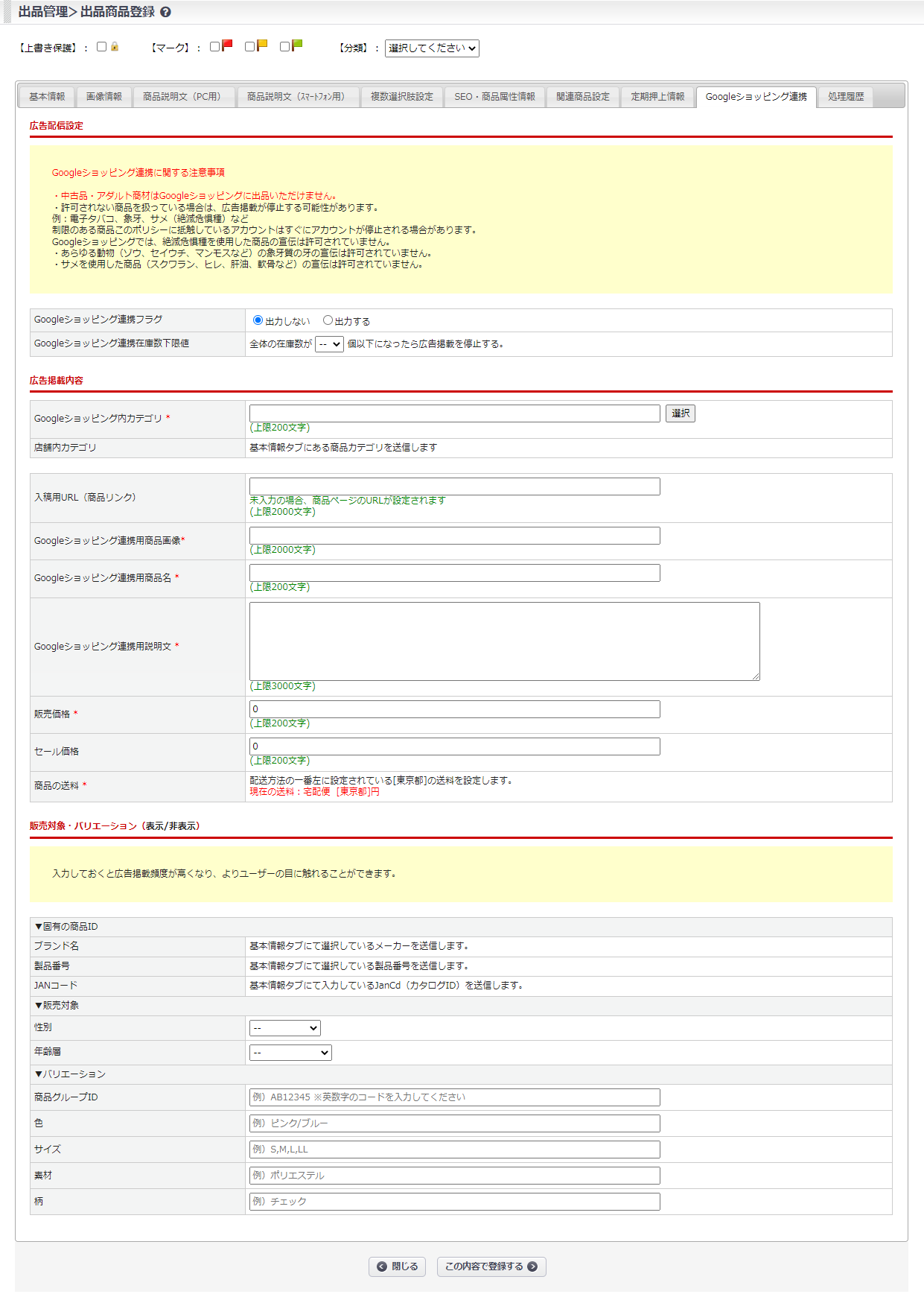 出品>出品商品登録>[Googleショッピング連携]タブ