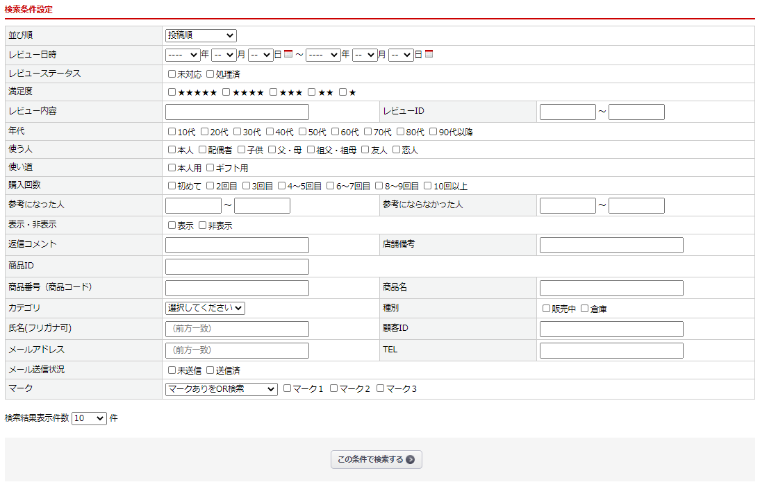 レビュー内容 検索対象となるレビュー内容を入力します。