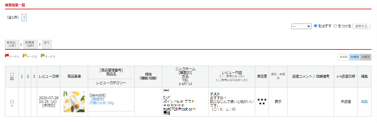 レビュー一覧:対象IDにチェックを入れて、「〇をつける」を選択後、