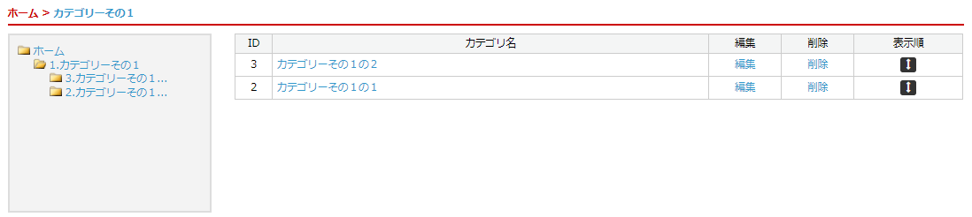 登録したカテゴリ(階層ごと)と登録内容が表示されます。