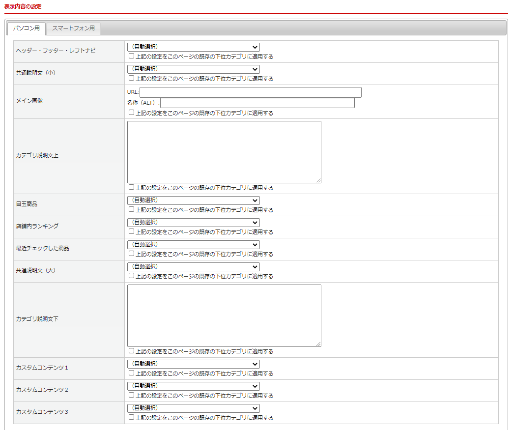 共通説明文(小)の表示内容を選択できます。 「デザイン(PC/SP)>ページ設定」と異なる 個別設定をする場合のみ変更してください。 |