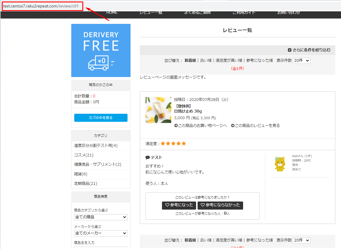 「レビュー>カテゴリ登録」にて登録した「カテゴリーURL」遷移していることがご確認いただけます。