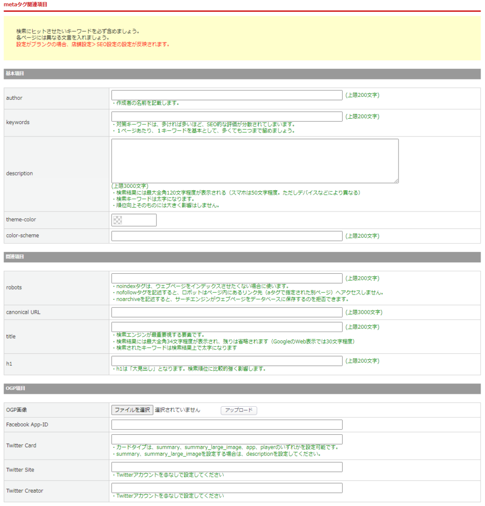 | canonical URL | 複数ある重複コンテンツを1つのURLにまとめる(正規化する)ことができる設定です。上限は3000文字です。 |