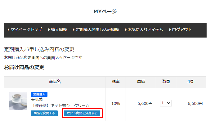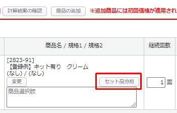 お届け商品の変更画面で「セット商品を分割する」を行うと、