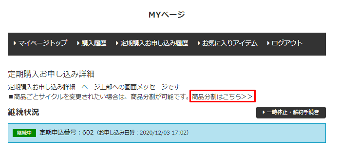 [分割可]を選択した場合、フロント「MYページ>定期購入お申し込み一覧」にて