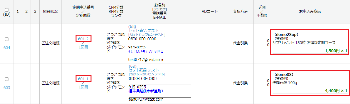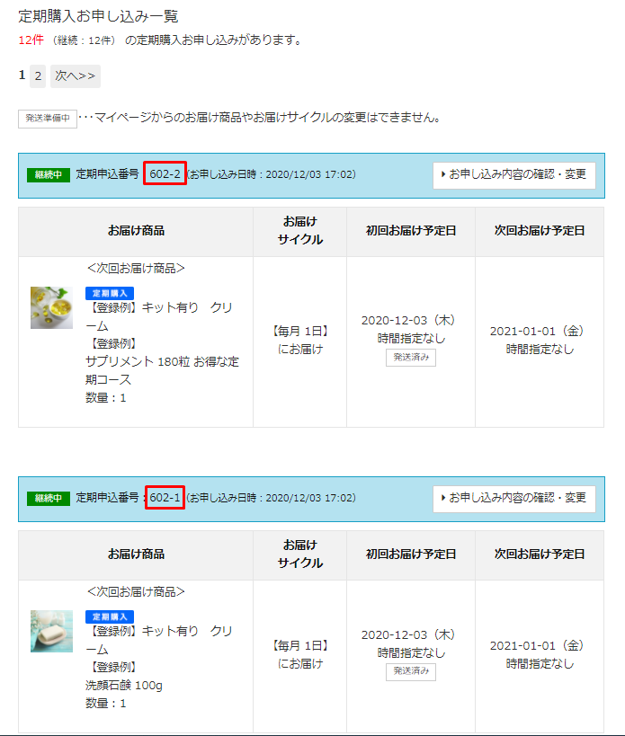 定期購入お申込み管理内でセット商品が分割され、複数明細が表示されます。
