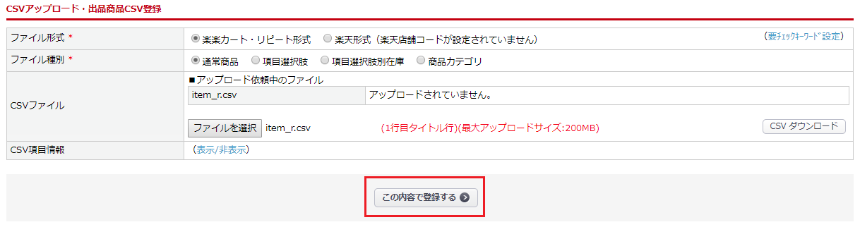 CSVアップロード・出品商品CSV登録からファイルを登録します。