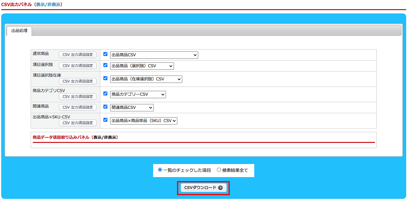 出品商品一覧のCSV出力パネルから出力が可能です。