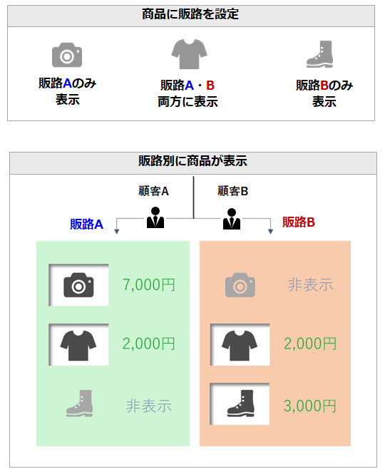 ・カメラ:販路Aのみ表示設定 → 販路Aの顧客のみに表示、販路Bの顧客では非表示
