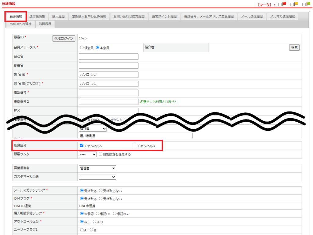[顧客情報]タブを開いた後、「販路区分」を選択してください。