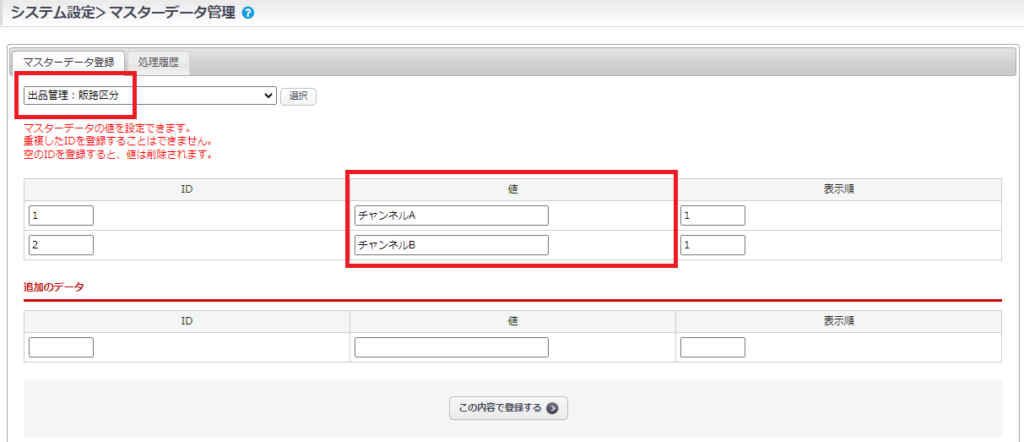 プルダウンより[出品管理:販路区分]を選択し、登録してください。