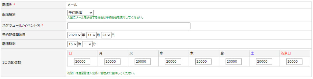| 1日の配信数 | 数量を入力 ※1日の配信数に設定されている数を上限として配信 ※祝日の場合、祝日に設定されている数を上限として配信 祝日の設定は 運営>定休日管理 より登録された内容が適用される |