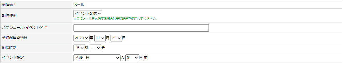 | 予約配信開始日 | 配信を開始する年月日を指定 ※未来の日時を入力 |