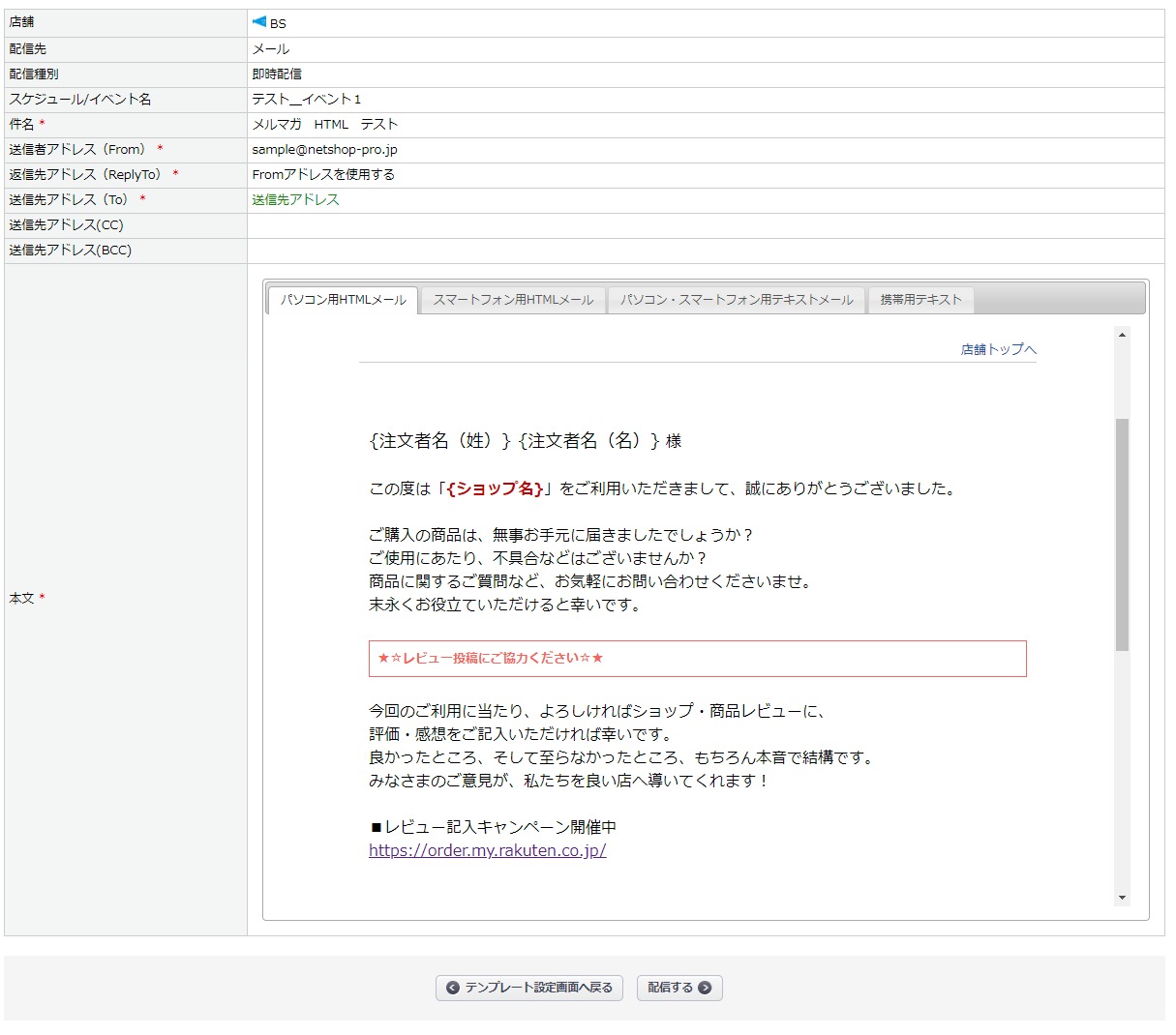 選択すると、[配信予約日時]の設定項目と、選択したテンプレートの登録内容が表示されます。