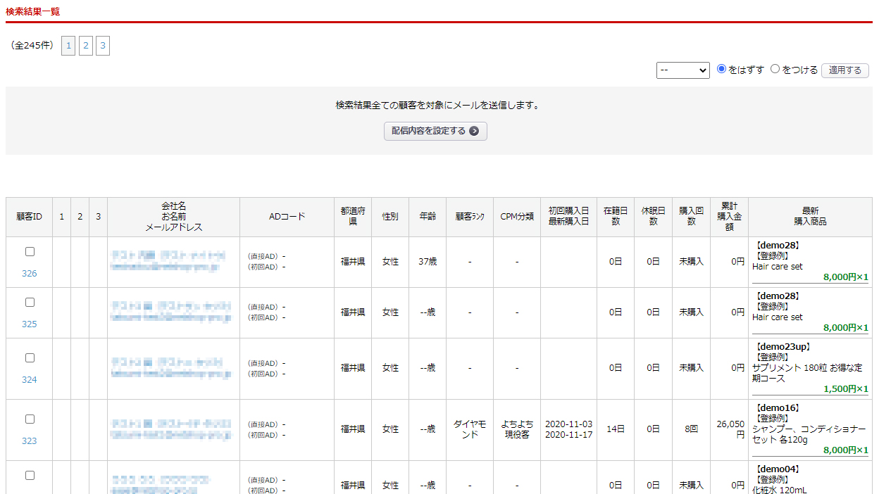 検索結果全ての顧客を対象にメールを送信しますので、検索結果を十分にご確認下さい