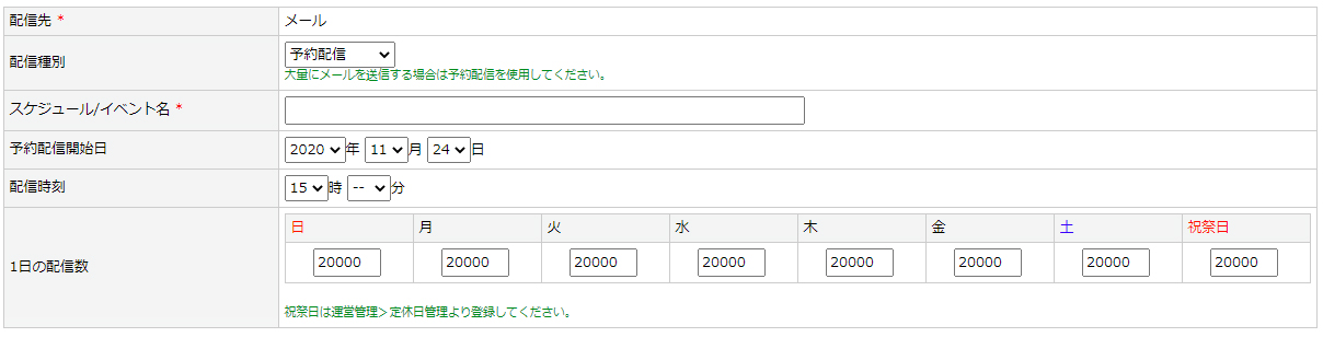 | 1日の配信数 | 数量を入力 ※1日の配信数に設定されている数を上限として配信 ※祝日の場合、祝日に設定されている数を上限として配信 祝日の設定は 運営>定休日管理 より登録された内容が適用される |