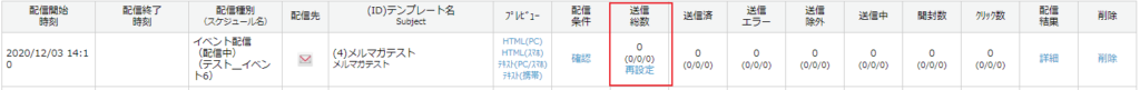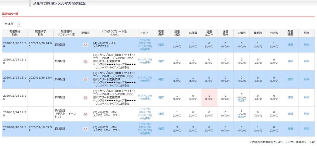 メルマガ>配信内容設定 から配信したメルマガの配信状況一覧です。