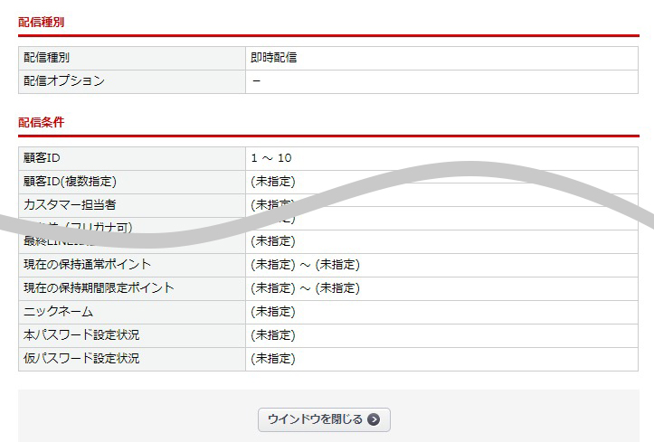対象のメルマガの「確認」をクリックすると、 メルマガ>配信内容設定 の絞り込みパネルで設定した配信条件と、配信種別が表示されます。