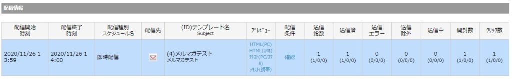 メルマガの配信状況が一覧で確認でき、配信結果などの確認が行えます。