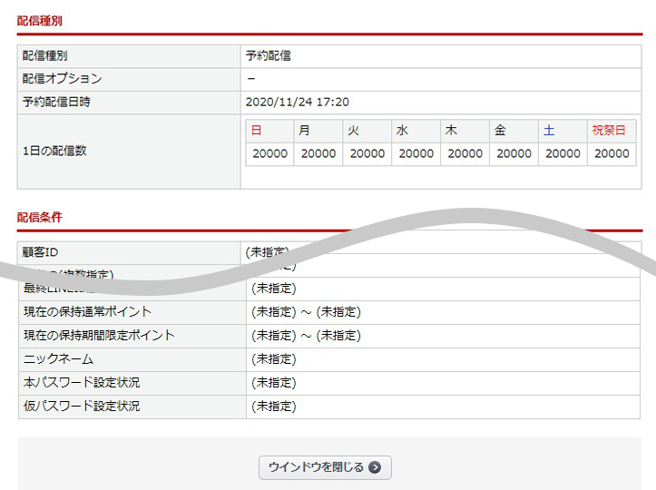配信条件列の「確認」リンクをクリックすると、 メルマガ>配信内容設定 の絞り込みパネルで設定した配信条件と、配信種別が表示されます。