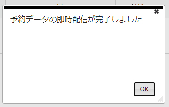 その後、「予約データの即時配信が完了しました」とポップアップが表示されますので、【OK】ボタンをクリックして下さい。