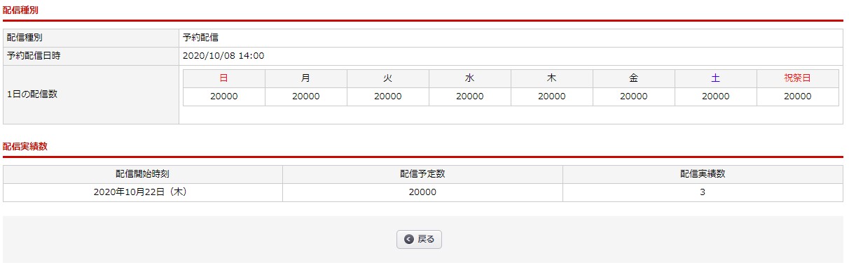 配信実績数の「確認」リンクをクリックすると、メルマガ>配信内容設定 へ遷移します。