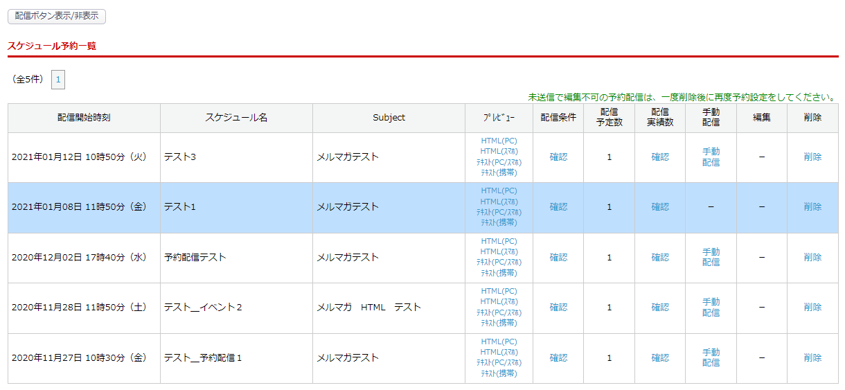 メルマガの予約状況を一覧で確認でき、編集や、手動配信なども行えます。