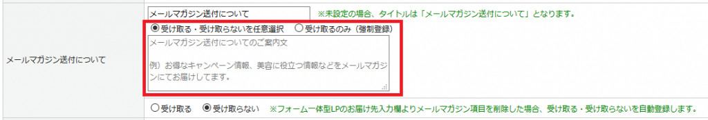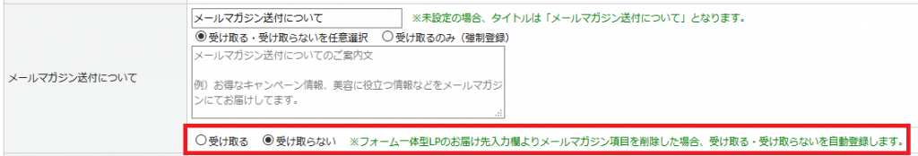 ※メールマガジンの配信には、事前にエンドユーザーに承認を得る(オプトイン)必要があります。本項目を非表示にした上でメルマガを「受け取る」にした場合、必ずどこかで承認を得るようにしてください。