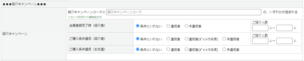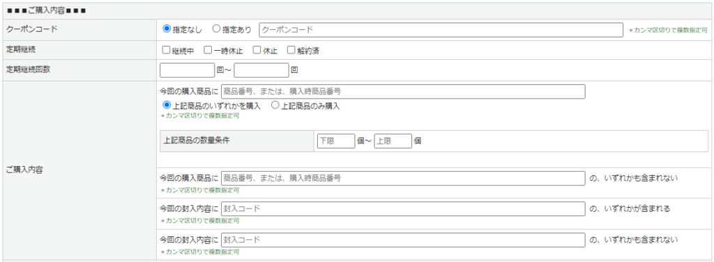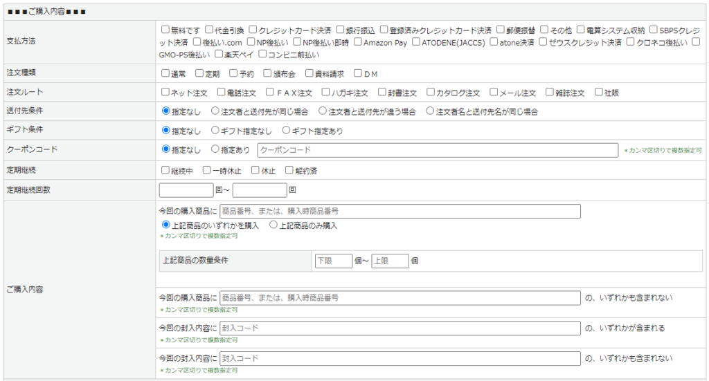 | 支払方法 | お支払方法を指定可能です。条件種別が開始条件の場合のみ項目が表示されます。※基本設定>支払方法設定で登録された支払方法が表示されます。 |